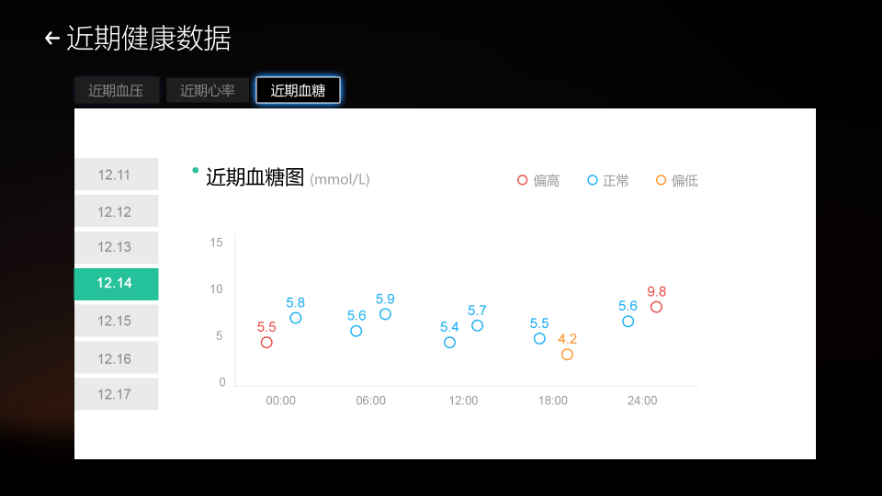 量血壓、血糖、心電等,測(cè)量完后的數(shù)據(jù)將會(huì)實(shí)時(shí)的傳送到電視、手機(jī)端app以及可